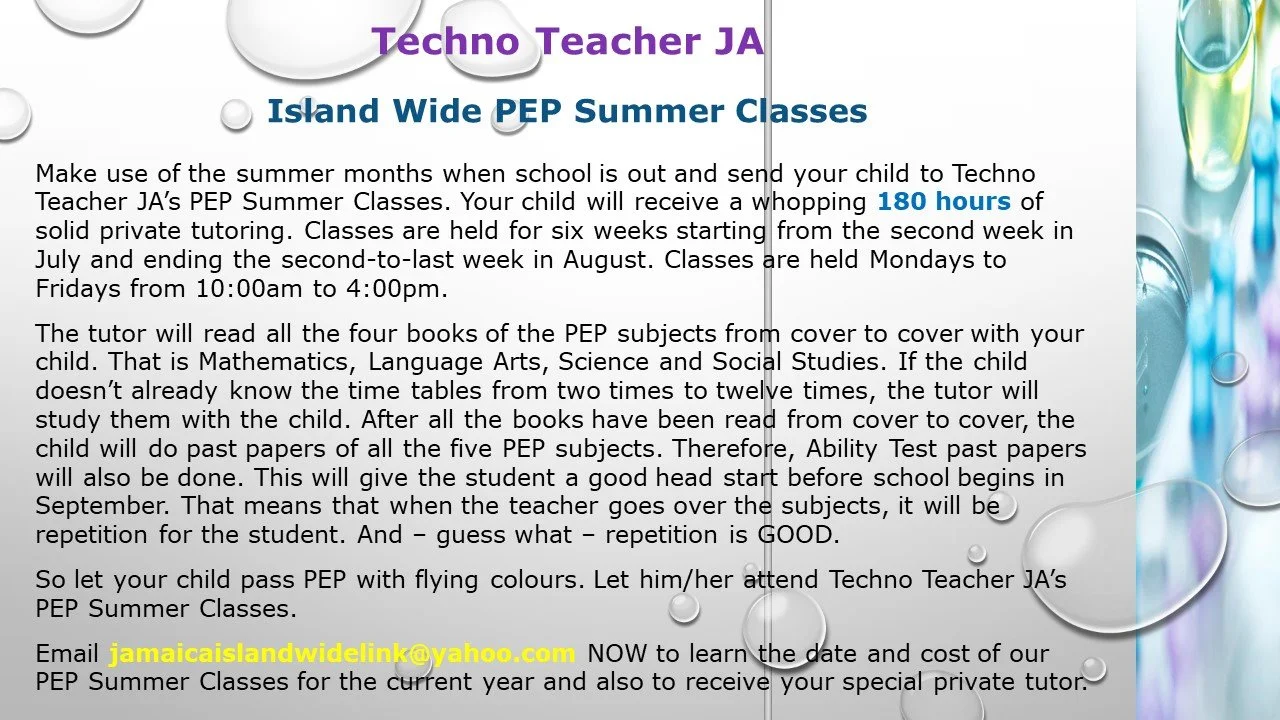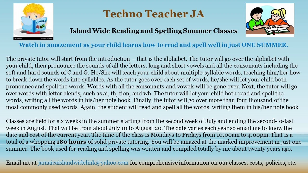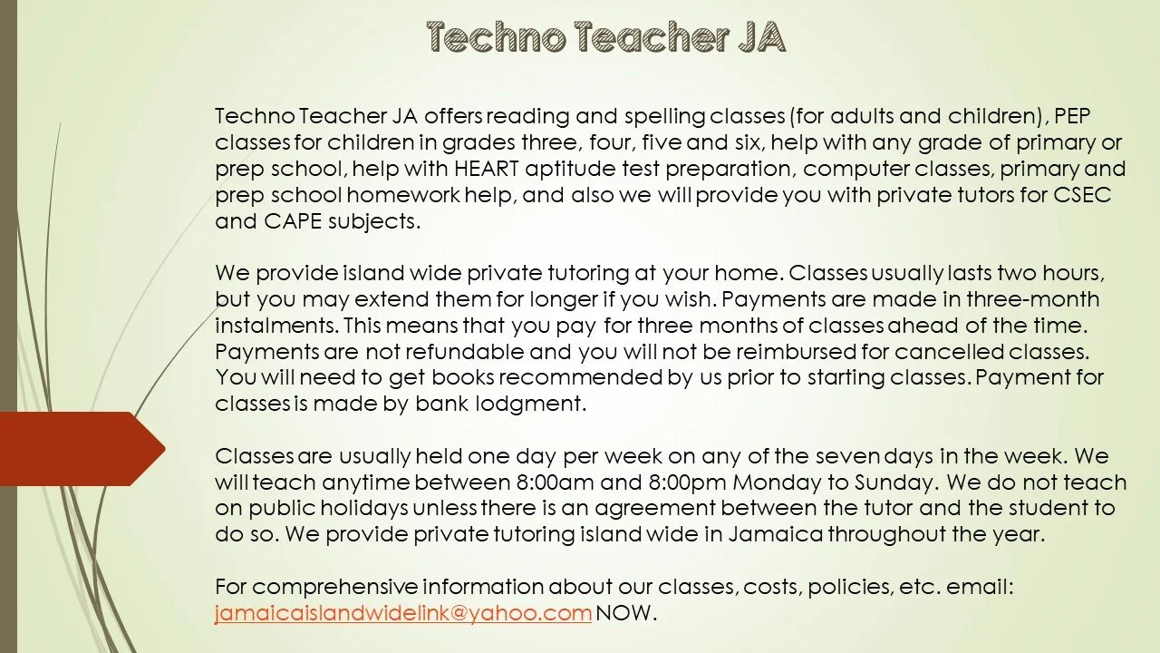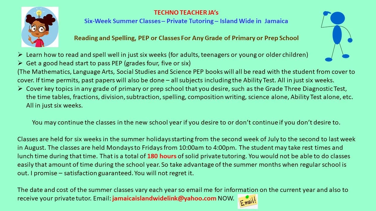 Tutors and schools island wide of any subject and grade (PEP, primary/prep school, reading, CXC, CAPE, tertiary, skills, special education, etc. are invited to advertise here.