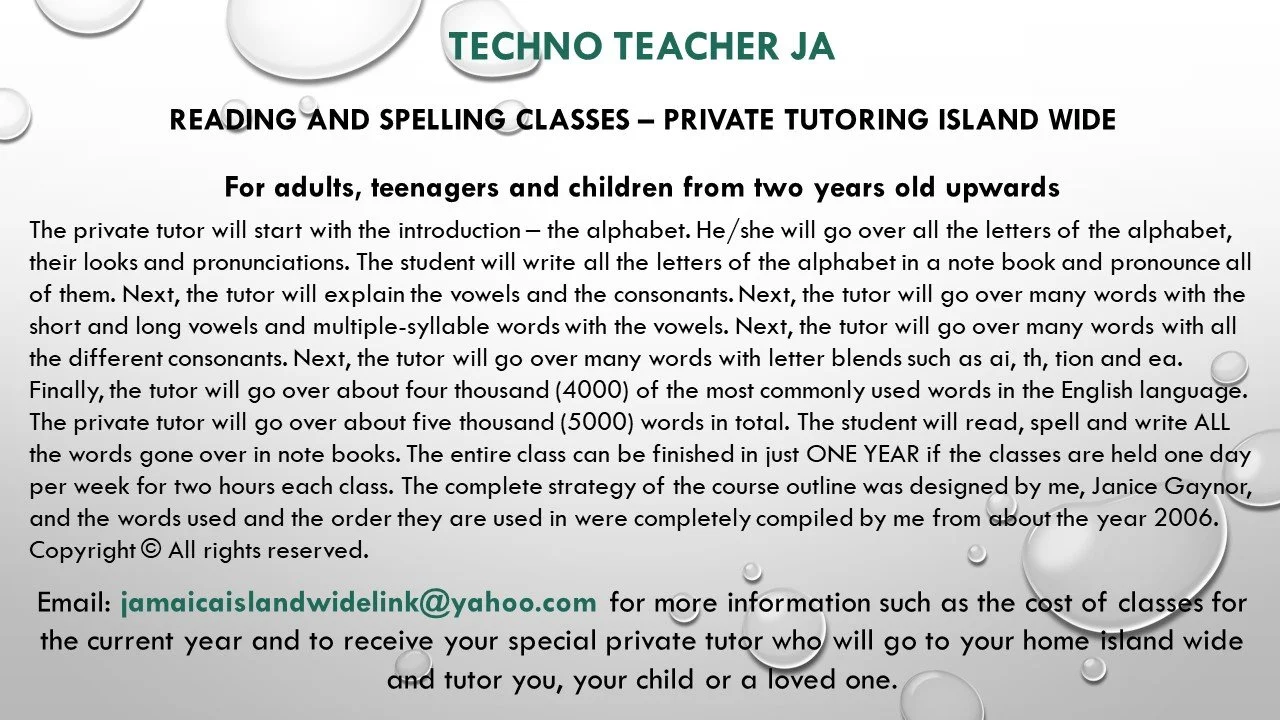 Lots more free videos are available on my two youtube channels. Their names are: (1) Janice Gaynor and (2) GSAT and Reading Techno Teacher JA.