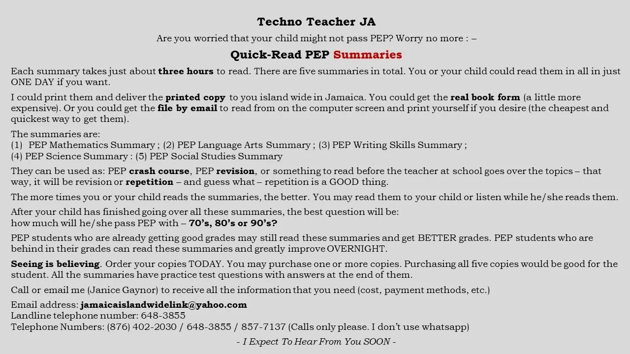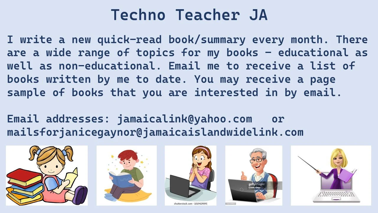 This is the list of my books (Janice Gaynor) to date (June 30, 2025). You may get the printed copy for just $5000 each plus delivery cost of $3000. Delivery is made by courier, etc. island wide. Purchase five or more printed copies at the same time and receive two extra printed books of my choice free. The cost for delivery remains the same - $3000. My books are generally summaries. Each book takes just about three hours to read. The names of my books to date are listed below. Thank you in advance for purchasing my books. Contact me for payment and delivery information.